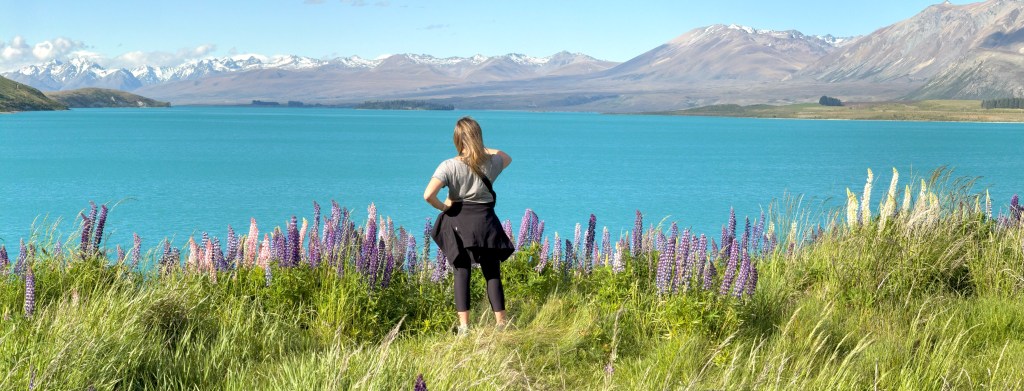 The next day we set off for the Mt. Cook area. We drove past Lake Pukaki, which, similar to Lake Tekapo, is completely undeveloped with crystal, turquoise water. Having the backdrop of the snow-capped mountains made it feel all the more majestic. So much of the scenery here reminded me of Alaska — grand mountains, bright lakes, colourful wildflowers and very few people.