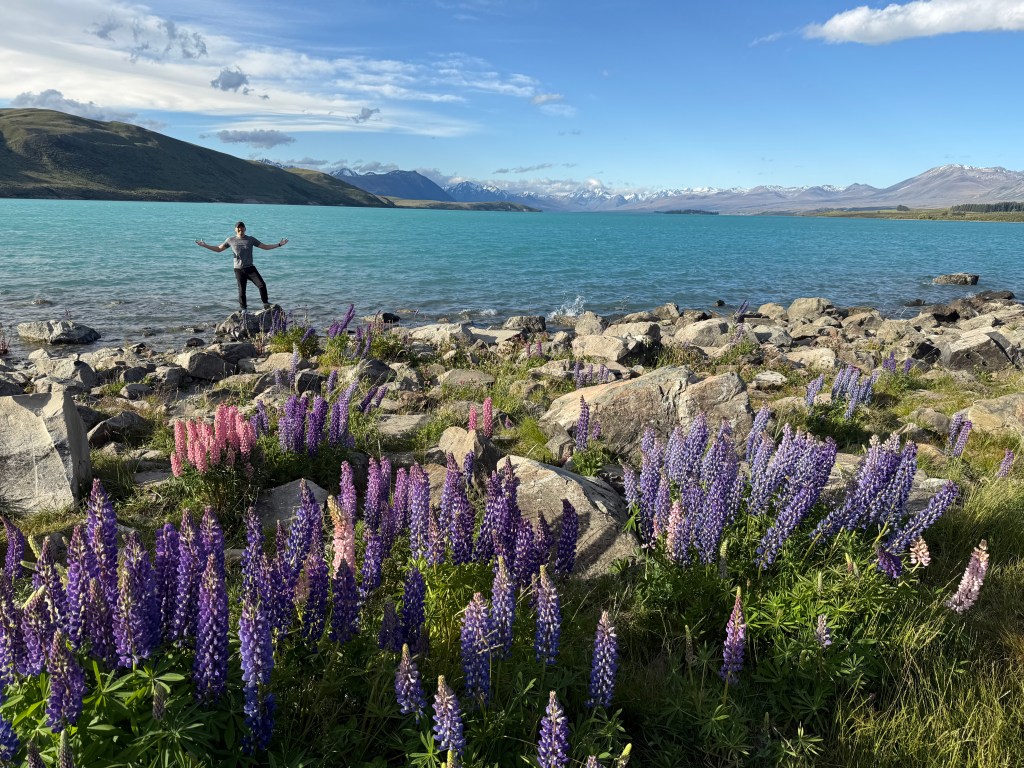 For our first night in Lake Tekapo, we stayed at Lakes Edge which is a gorgeous camp/RV park on the bank of the lake. It is an easy 20 min walk into town to the famous Church of the Good Shepherd, but given that we stopped every three steps to take photos of the gorgeous purple and white lupin flowers, it took us a good hour 🙂